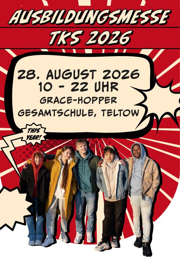 Ein besonderer Dank gilt auch in diesem Jahr unserem starken Partner, der Grace-Hopper-Gesamtschule in Teltow. Die Messe findet erneut in den modernen und inspirierenden Räumlichkeiten der Schule statt – ein idealer Ort, um Begegnungen zu schaffen und Zukunftsperspektiven zu eröffnen.
